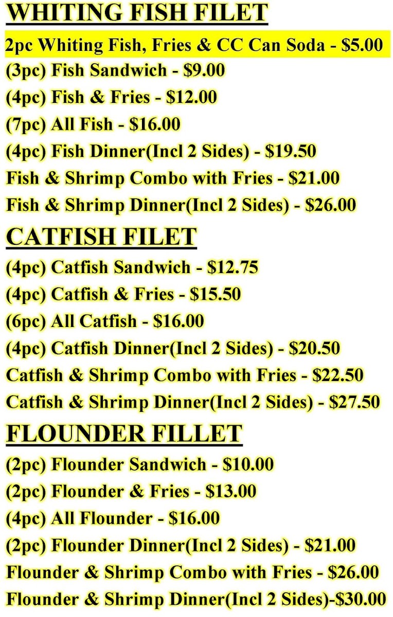 Catfish 2pc, Whiting Fish 4pc, Jumbo Shrimp 6pc & Fries