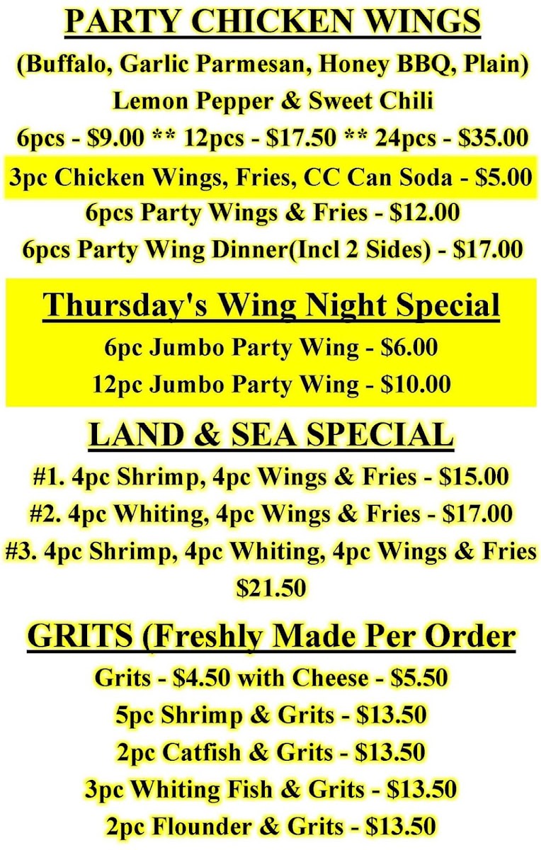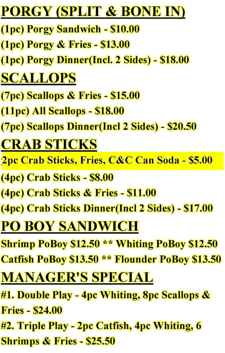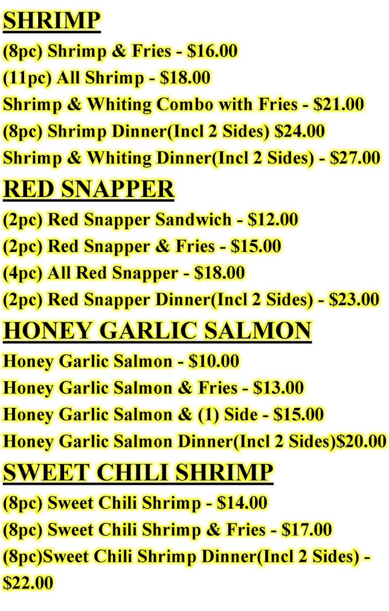 Flounder lovers will appreciate the Flounder Sandwich, All Flounder 4pc, and the satisfying Flounder & Fries. If you're in the mood for a sit-down meal, try the Flounder Dinner (2 Sides) or Flounder and Grits for a flavorful, filling dish. For a touch of sweetness and savory flavors, the Honey Garlic Salmon is a standout choice.